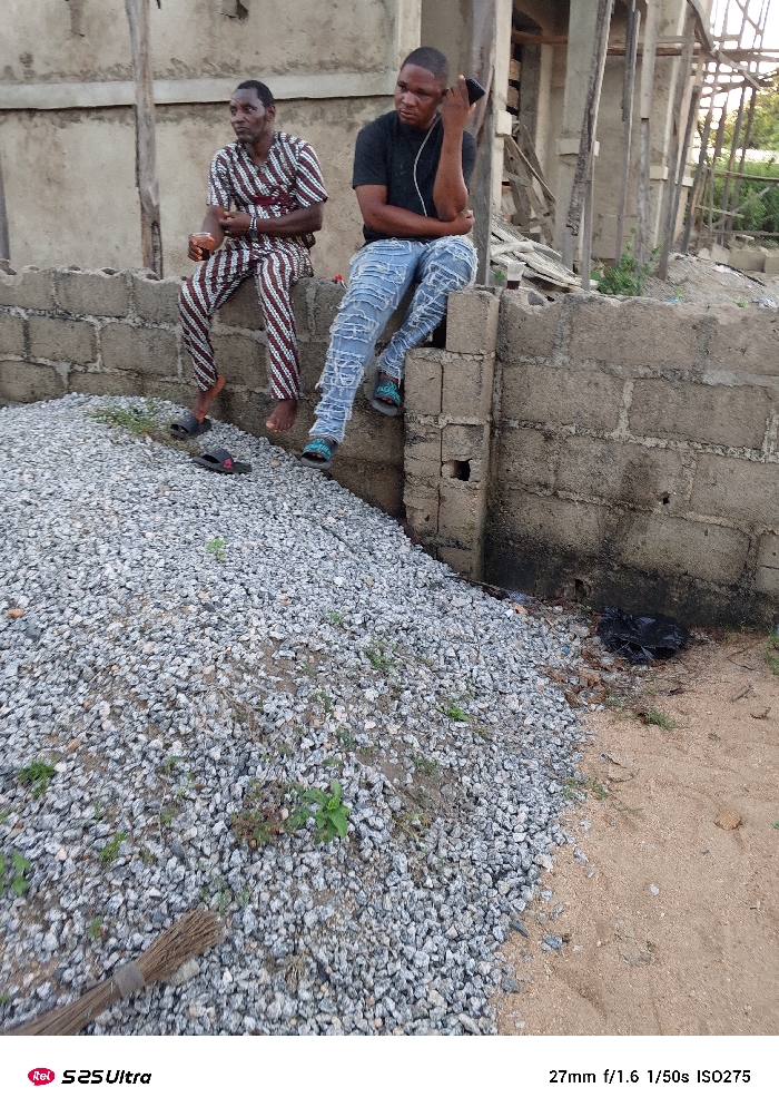 Two adult males are depicted sitting on a low, unfinished concrete block wall in Zango-ndaji, Nigeria