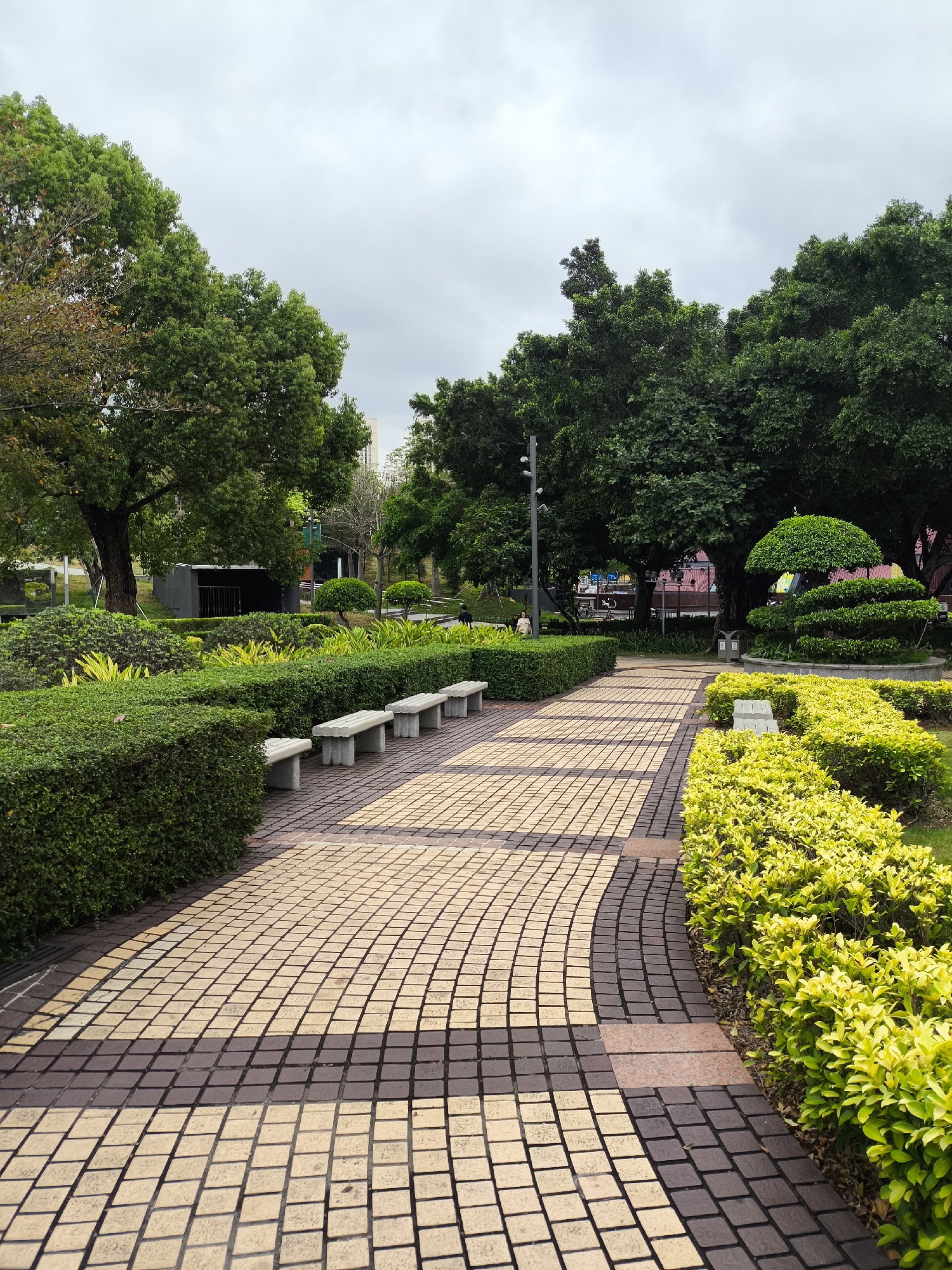 public park in Longgang District, China, marked by meticulously manicured hedges and trees. A brick walkway, patterned in alternating rows of tan and brown, curves gently through the landscape. Three concrete benches sit along the edge of one hedge. A person is walking in the background. The weather appears overcast, with a gray sky overhead.