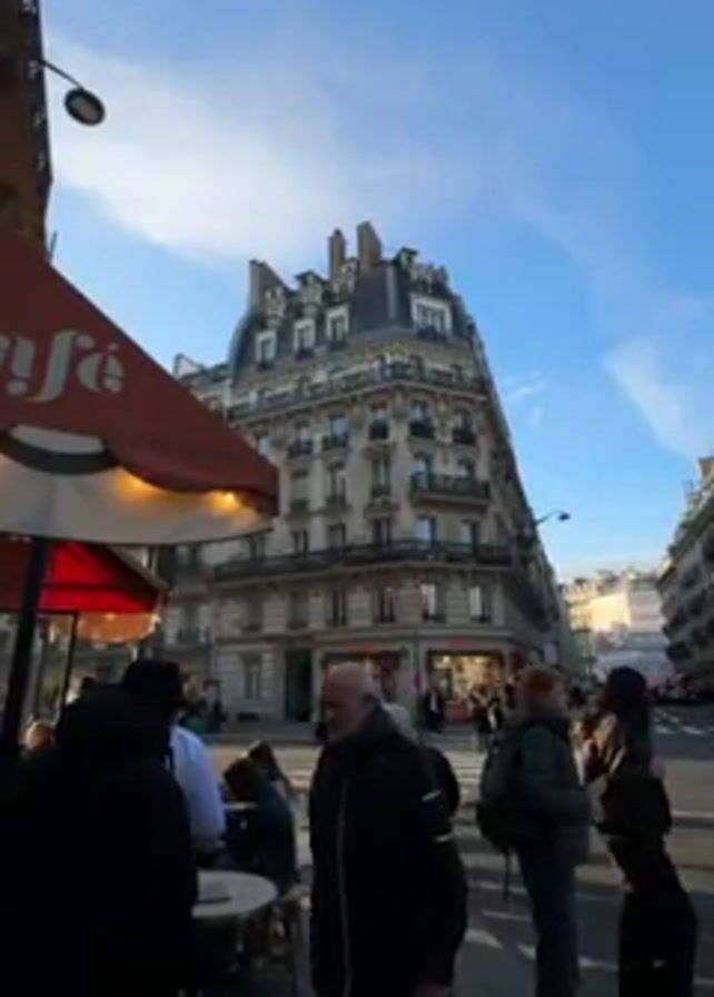 The camera is looking at an intersection in Paris, France. The day is bright and clear with a blue sky. In the foreground, a cafe awning is on the left with people standing beneath it. People are walking along the sidewalk and crossing the street. A bicycle and a taxi pass by. In the background is an ornate, multi-story building on the corner.