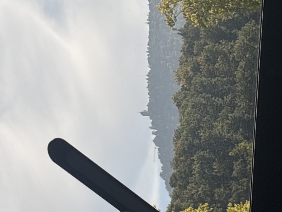 The image displays a distant landscape view, captured from an interior vantage point, likely a vehicle, located in or near Lièpvre, France