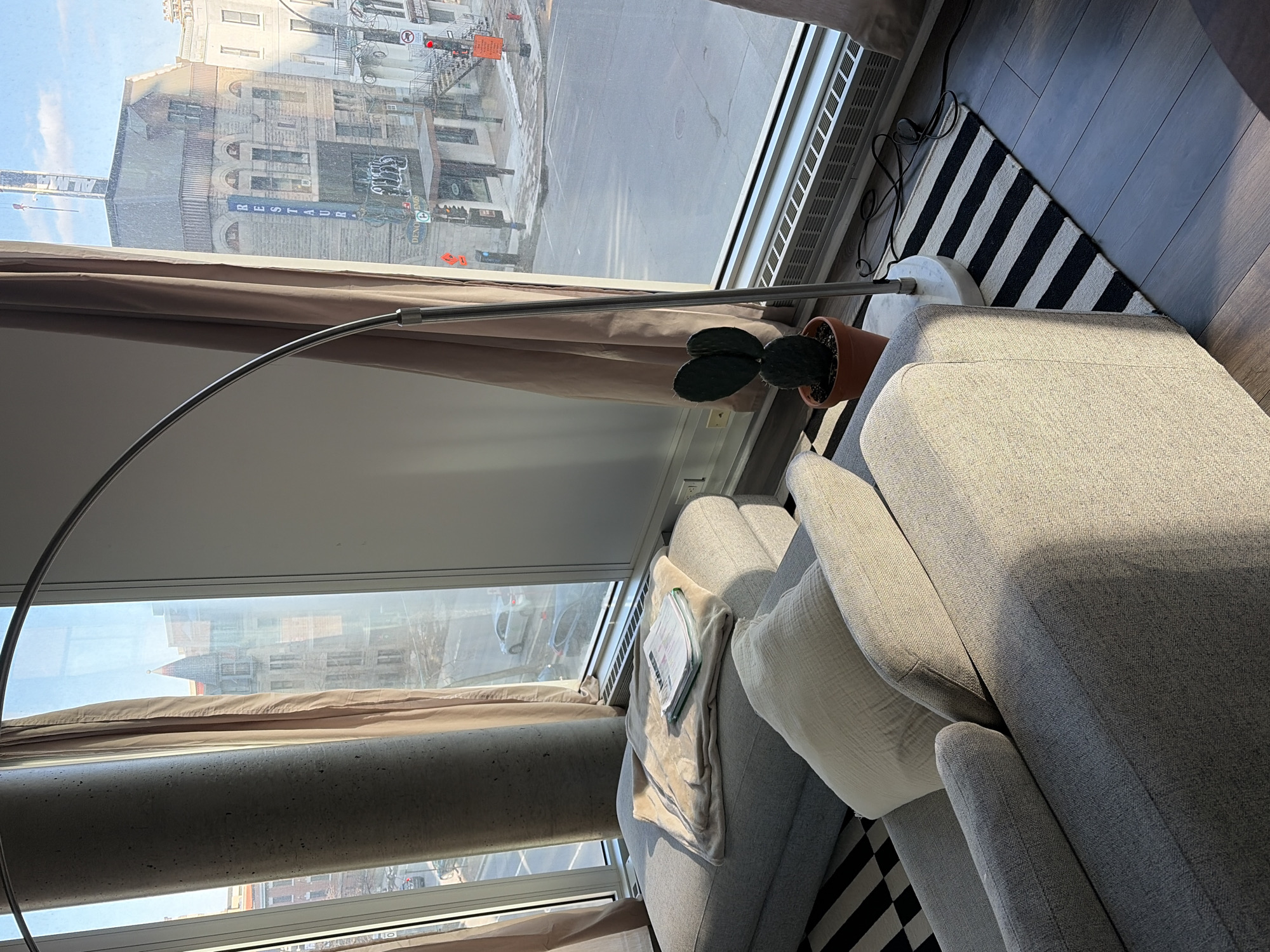 n interior scene with a partial view out a window. Objects: A grey sofa with white pillows, a cactus in a terracotta pot, a floor lamp, a black and white striped rug, and a radiator. Environment: Outside the window is a cityscape with buildings, street signs, and traffic lights. Location: Based on the street signs and architectural styles visible through the window, the image is likely in Montreal, Canada. Specifically, the building across the street is the "Deno Restaurateur" on Rue Alma, Montreal.