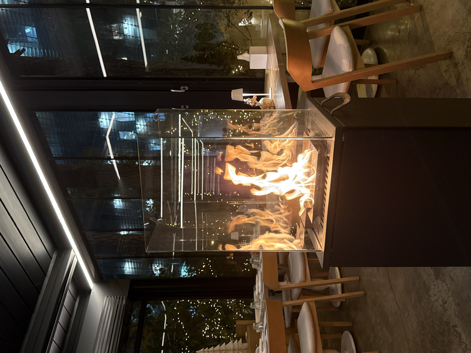 A modern, dimly lit indoor setting presents a contemporary glass-encased fireplace with vibrant flames. Tables adorned with plates and chairs are situated nearby. The building's architecture is highlighted by long, illuminated structures, adding depth to the scene. Through the glass exterior, trees decorated with small lights are faintly visible, suggesting an outdoor space.