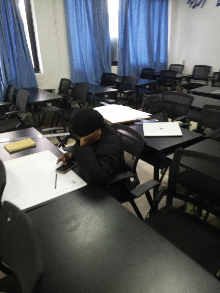 An individual wearing a dark head covering and jacket sits at a desk in a classroom. Their face is partially obscured by their hand. A mobile phone and paperwork rest on the desk in front of them. Several rows of empty desks and chairs fill the room, illuminated by daylight filtering through windows covered with blue curtains. A laptop is also visible on a nearby desk. The classroom appears empty except for the person at the desk.