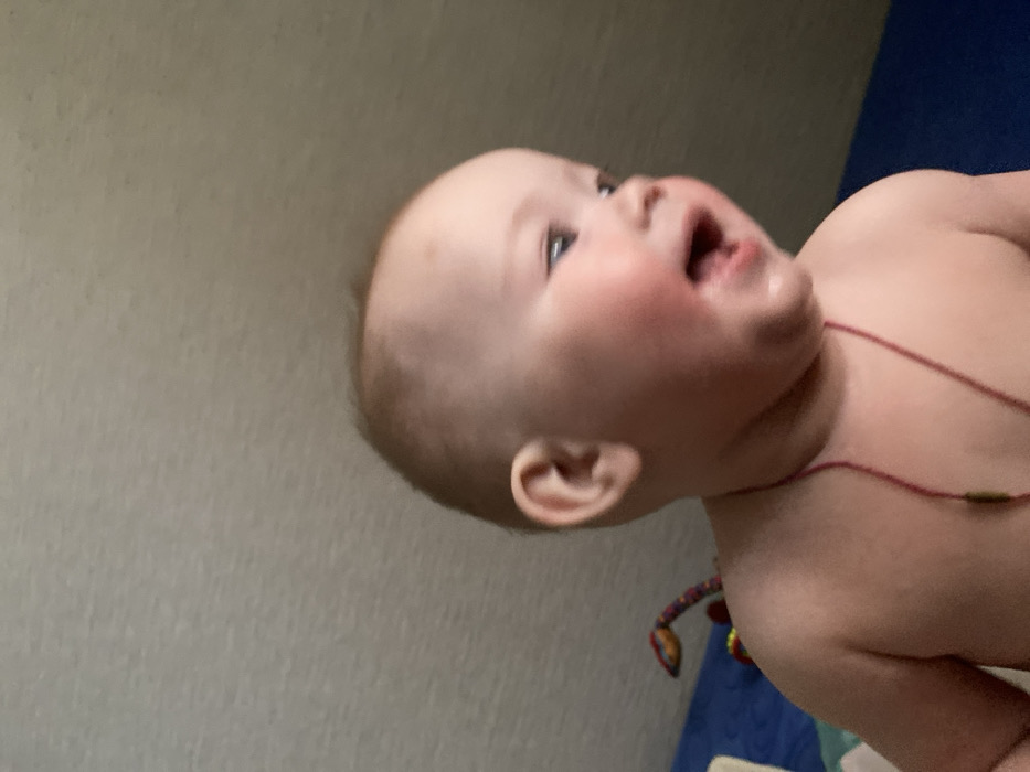 A fair-skinned baby is the focal point, looking upwards with an open mouth. The baby is mostly unclothed. A thin red string necklace adorns the baby's neck. The background consists of a beige wall and a blue surface, possibly a blanket or mat. A colorful toy is also visible near the baby. The baby's face is turned to the right, with a visible ear and plump cheek.