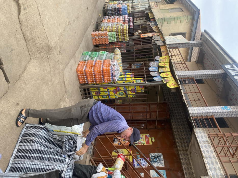 The image depicts an outdoor commercial scene in Bukuru, Nigeria, featuring a man interacting with large bags of goods near a storefront