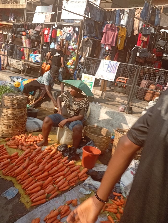 A vibrant market scene unfolds with carrots dominating the foreground, arranged neatly on a cloth. A vendor sits nearby under a green umbrella, while another person appears to be washing items. Stacks of woven baskets and a red bucket add to the atmosphere. Garments hang on racks behind them, creating a backdrop of a bustling marketplace. A sign reading "POS" is visible, amidst a casual setting.