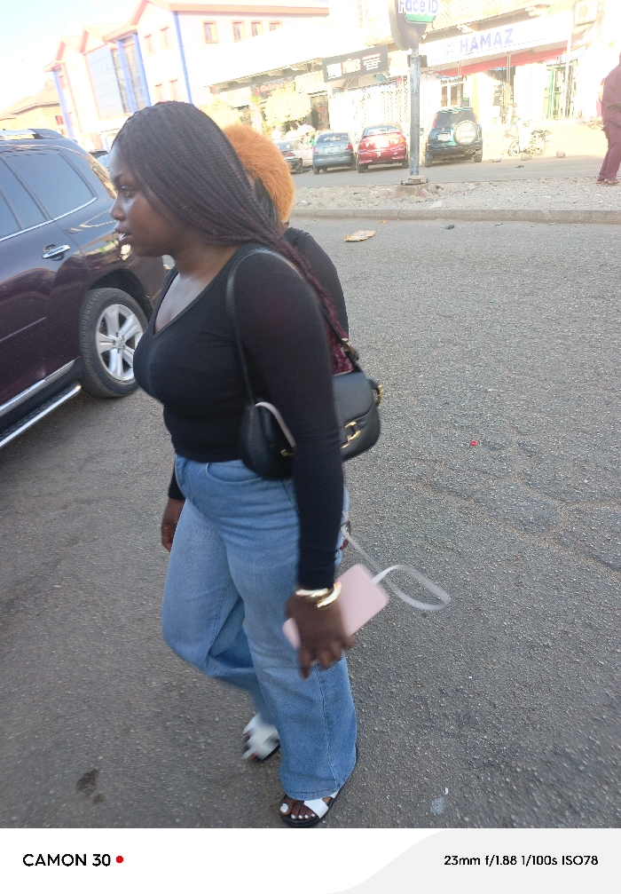 This image depicts an outdoor street scene in a commercial district of Jos, Nigeria, identified by a visible storefront sign for "HAMAZ" and a "FaceID" sign on a street pole. The primary subject, a woman of African descent, is captured in mid-stride, walking left across an asphalt road. She is dressed in a black long-sleeved V-neck top, light blue wide-leg jeans, and white flat sandals. Her hair is styled in dark braids, and a patch of reddish-orange hair is visible behind her. She carries a black shoulder bag with a gold-colored clasp on her right shoulder and holds a light pink smartphone with a white wrist strap in her left hand. Two gold-colored bangles are visible on her left wrist. To the far left, the rear section of a dark-colored SUV is partially visible, parked parallel to the road. In the background, several vehicles—including a green SUV, a red sedan, and a blue sedan—are parked along the opposite side of the street, in front of multi-story commercial buildings. A person in dark red clothing stands on the far right sidewalk. The asphalt road surface shows minor scattered debris, including a small red object. Natural daylight illuminates the scene.