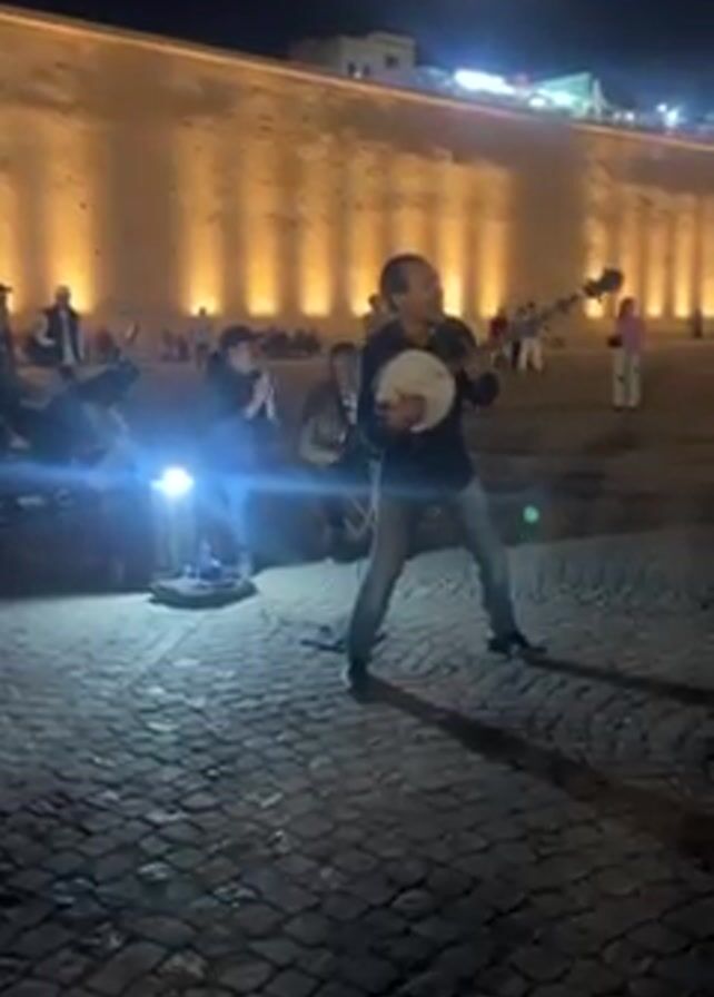 The scene is a night view of a plaza with cobblestone pavement and a high, illuminated wall in the background. The wall is lit with warm-toned lights. A musician stands in the center, playing a banjo-like instrument. He is dressed in jeans, a dark shirt, and black shoes. He has short hair and appears to be singing or vocalizing along with his playing. There are several people watching the musician, some are seated and some are standing. A bright light is pointed towards the musician, creating a strong shadow behind him. To the left, a parked motorcycle can be seen. The background includes other individuals strolling around the plaza and the night sky is visible with a bright moon.