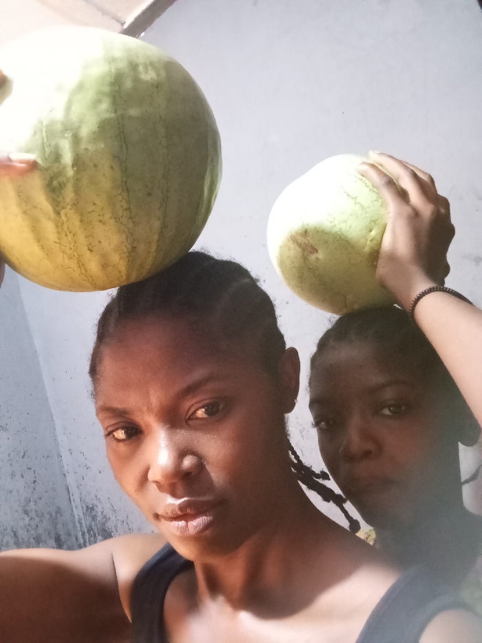 Two dark-skinned individuals, appearing to be adult females, are depicted in a close-up shot against a plain, light-colored background. The person in the foreground, positioned on the left, has dark braided hair and wears a dark tank top. A large, green, striped watermelon is balanced on her head. She looks directly into the camera with a neutral expression. Behind and to the right, a second individual, also with dark braided hair, is partially visible and slightly out of focus. A smaller, lighter-colored watermelon is balanced on her head, supported by her right hand. She wears a dark beaded bracelet on her right wrist. Both individuals appear to be looking towards the camera. The background is an unadorned, light-colored wall, with a darker horizontal structure visible at the top edge of the frame. The lighting is bright, casting distinct highlights and shadows on the subjects. The location is Unknown, Unknown.