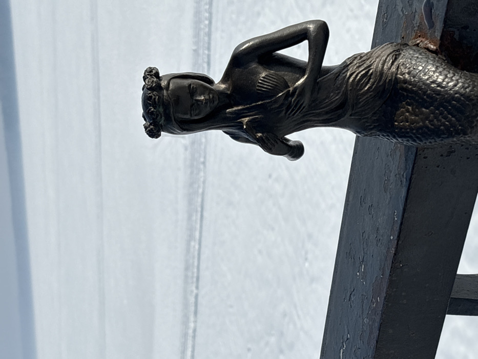 - "A dark metal statue of a mermaid is centrally positioned on a weathered dark railing, overlooking a vast, frozen, snow-covered body of water under a light, overcast sky" by FM-2iDiG2, licensed under CC BY 4.0