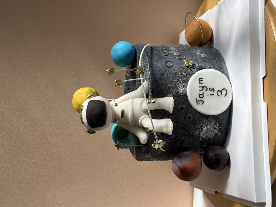 - "A space-themed birthday cake is centered in the frame, resting on a white square cake board" by FM-k41Xm2, licensed under CC BY 4.0