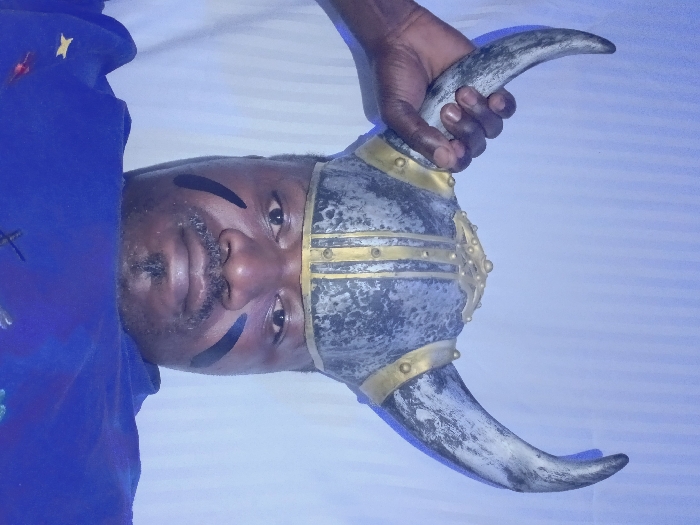 A man is shown holding a horned Viking helmet above his head. He has dark skin, short black hair, a mustache, and a goatee. He has black paint under his eyes. He is wearing a blue t-shirt. The helmet is mostly gray and gold. The background is an out-of-focus, light blue surface. The image is rotated to the side.