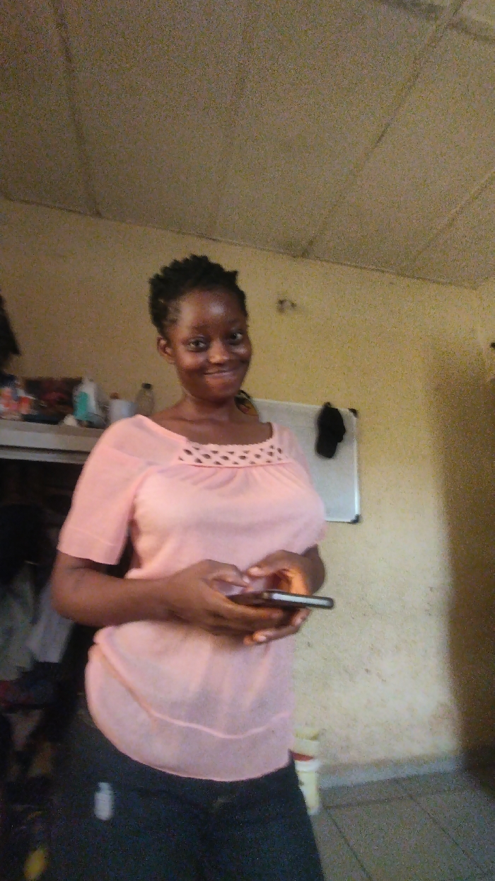 A young woman smiles, looking towards the camera, while holding a smartphone. She wears a light pink blouse with a decorative neckline and dark pants. The background shows a simple room with a beige wall, a whiteboard with a dark object hanging on it, and a shelf with various items. The ceiling appears textured and the overall lighting is dim.