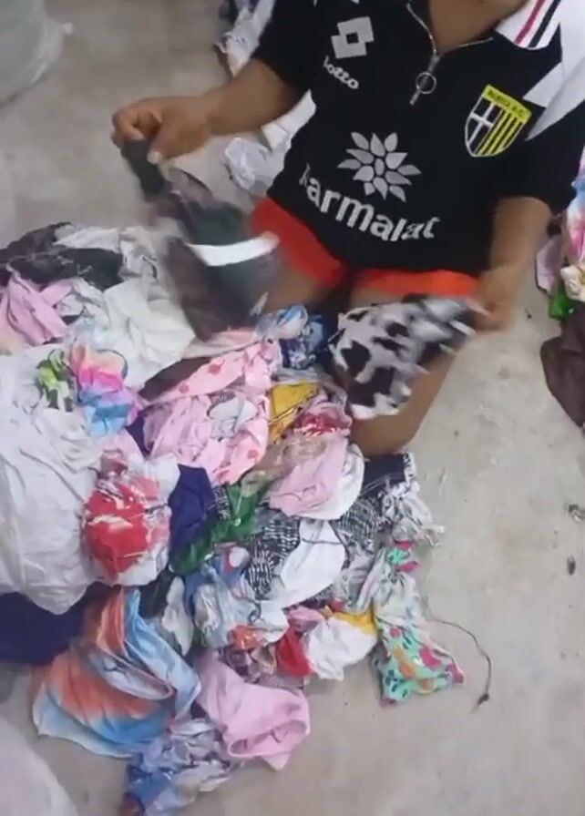 A person kneels on the floor surrounded by a large pile of colorful clothes. They are wearing a black and white soccer jersey, orange shorts, and a blue head covering. They are picking through the clothes, holding up a white garment. The floor is gray concrete. There are bags of clothes in the background.