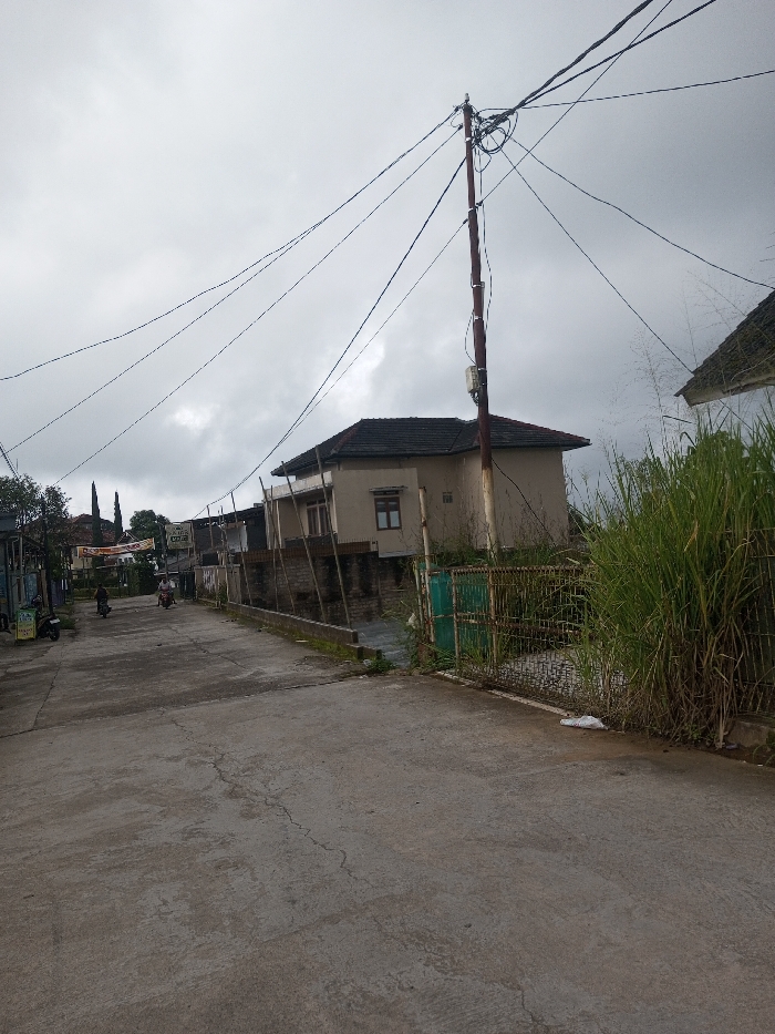 This image depicts a residential street in Ciherang, Indonesia, under an overcast sky
