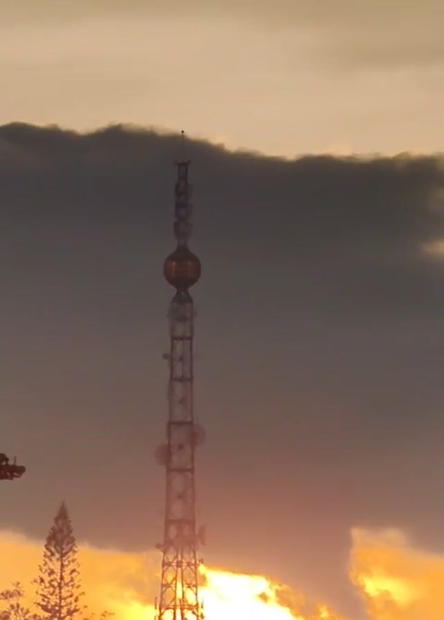 tall radio tower silhouetted against a vibrant sunset. The sky is a mix of dark, looming clouds and brilliant orange light emanating from behind the tower. Several people are silhouetted on some steps in the foreground, with some trees and other structures visible as well.