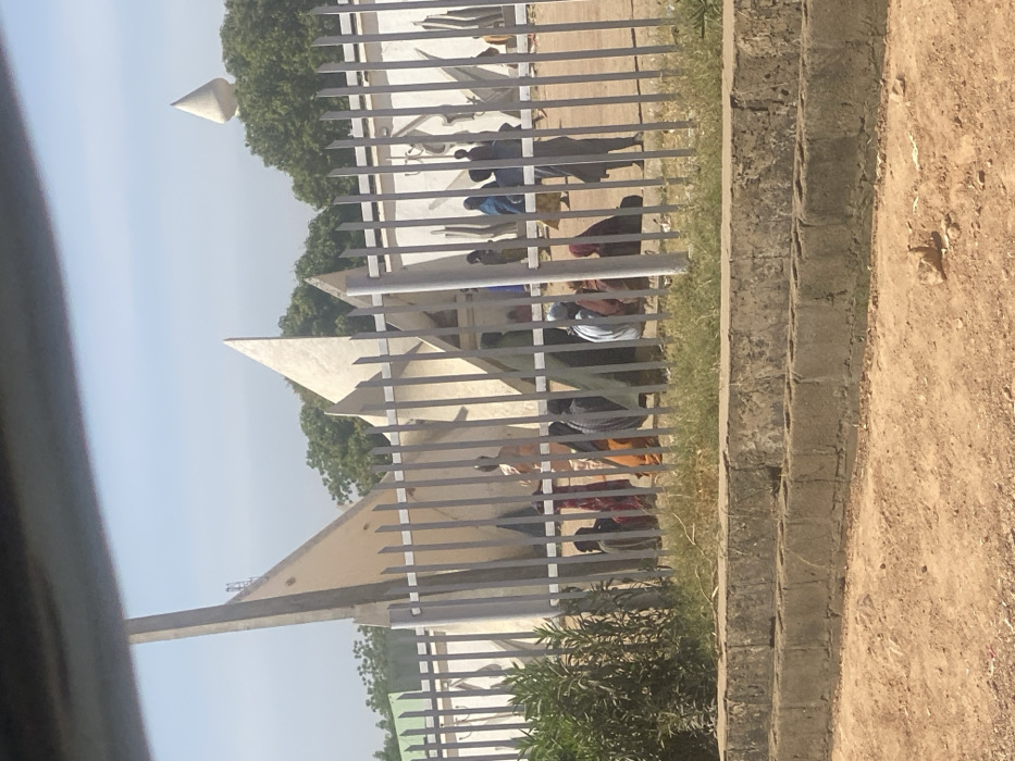 The image depicts an outdoor scene in Kabuga, Nigeria, observed through a metal fence. In the immediate foreground, a dirt ground transition into a low, multi-tiered concrete block wall. Behind this, a grey metal fence composed of vertical bars separates the viewer from the primary scene. Sparse green vegetation, including a small bush, grows between the wall and the fence. Beyond the fence lies an expansive area of reddish-brown dirt. Numerous large, abstract, light-colored concrete or stone structures, resembling pointed blades or sails, are distributed across this area, varying in height and angle, forming part of a monument or architectural installation. Approximately 15 to 20 individuals, predominantly adults, are gathered within this area, among the structures. Most are seated or squatting on the dirt ground, while a few stand. They are dressed in various traditional garments, including robes and head coverings, in colors such as orange, blue, red, grey, and brown. No distinct actions or direct interactions are discernible beyond their collective presence. In the background, a line of green trees is visible, with a distinctive white, conical structure mounted on a pole or building rising above the treeline on the right. The sky is clear and light blue, indicating daytime conditions.