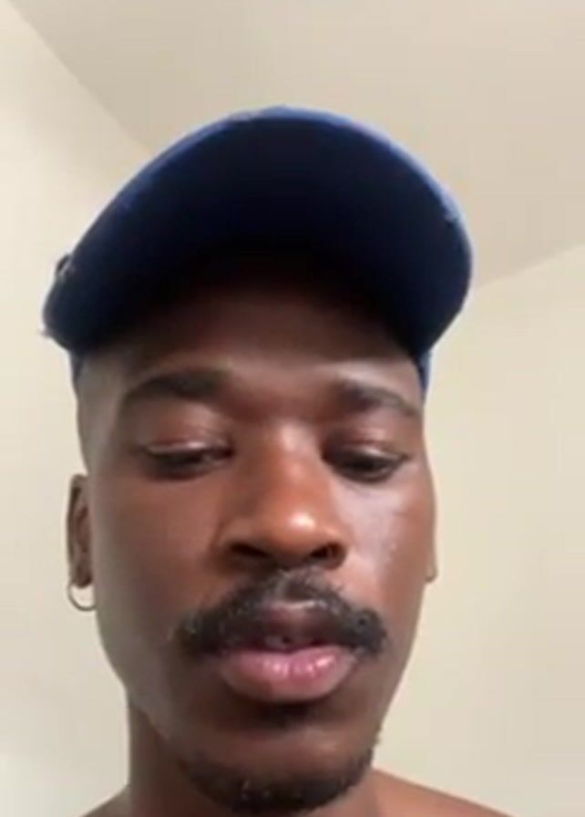 A man is recording a close-up video of himself. The man is light-skinned with short, dark hair and a mustache. He is wearing a blue baseball cap and a small gold hoop earring on his left ear. He appears to be shirtless. The background is a white wall with a white ceiling light. The man is looking at the camera and speaking.