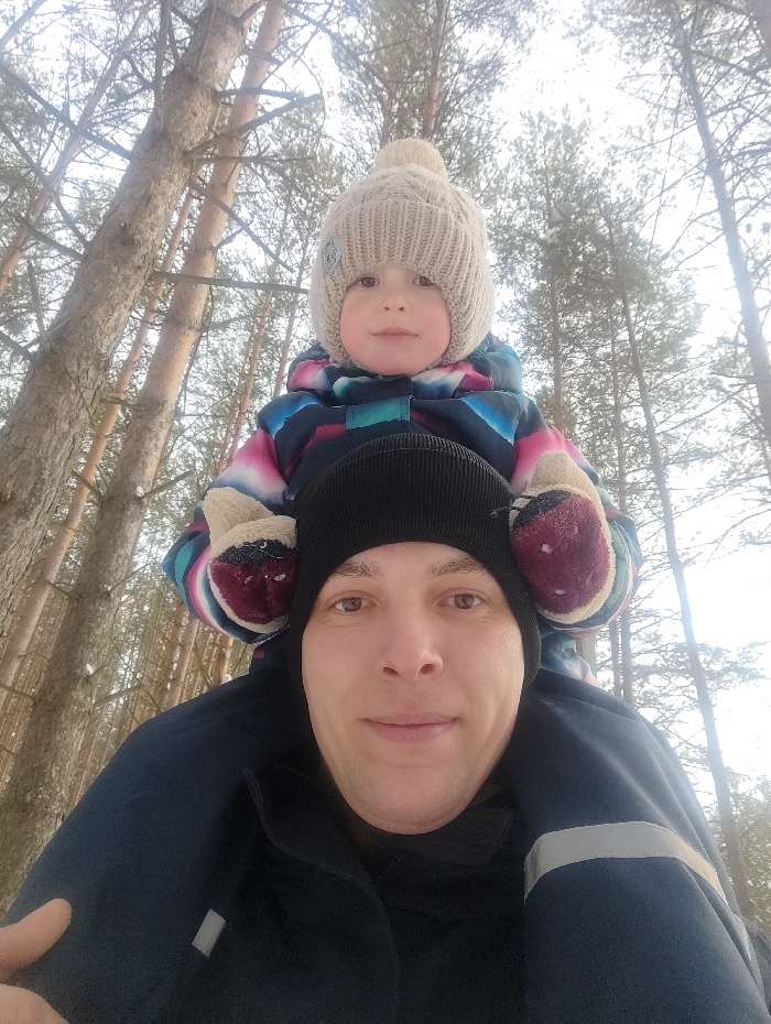 - "An upward-angle outdoor photograph depicts an adult male carrying a young child on his shoulders in a wooded area within the city of Chaikovsky, Russia" by FM-1C5Nu2, licensed under CC BY 4.0