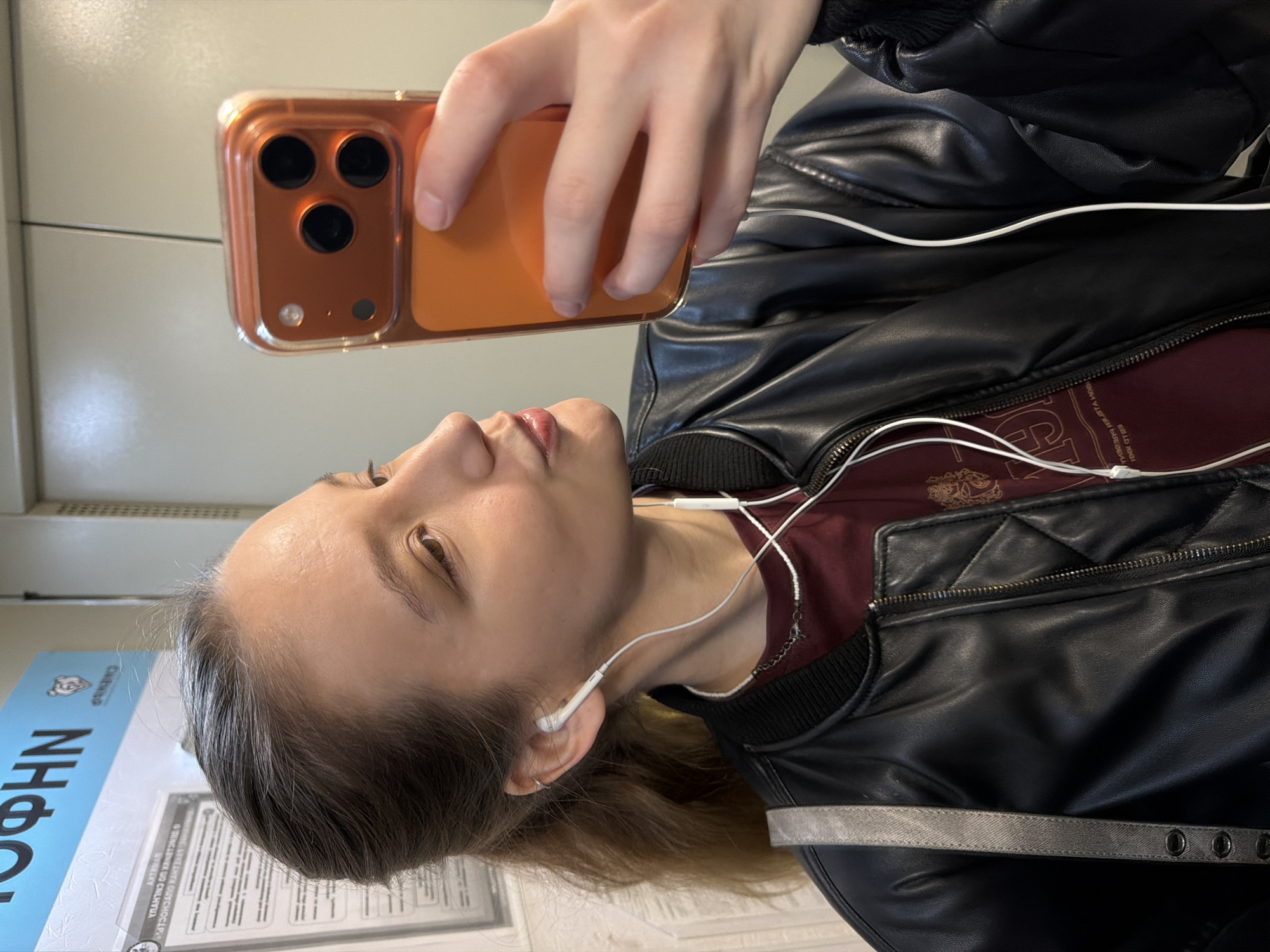 A young adult female is depicted from the upper chest level, taking a selfie with a mobile phone inside what appears to be a public transport vehicle in Krasnodar, Russia. She has light brown hair pulled into a ponytail and fair skin. Her lips are slightly pursed. She wears a small silver hoop earring in her left ear cartilage. Both ears contain white wired earbuds. Her attire consists of a maroon t-shirt with a light-colored graphic design partially visible, covered by a black glossy bomber jacket with a zippered front and quilted stitching on the side panels. A white beaded necklace and a thin silver chain are around her neck. A grey fabric strap, possibly from a bag, is visible over her left shoulder. She holds a mobile phone in her right hand, oriented for a selfie. The phone is an iPhone model with three prominent rear camera lenses and a flash, encased in a clear or translucent orange-tinted protective case. Her thumb is visible on the lower part of the phone. The background consists of light-colored, utilitarian wall panels. To the upper left, a blue sign with white Cyrillic text is visible, reading "ИНФОРМАЦИОННЫЙ" (INFORMATIONAL) and partially "ТОФН" (likely part of "ТЕЛЕФОН" - TELEPHONE). A white bear's head logo, characteristic of Krasnodar Krai, is also present on the blue sign. Below this, a white document or poster with black Cyrillic text, appearing to be official information or regulations, is attached to the wall. A vertical seam in the wall panel is visible to the upper right.