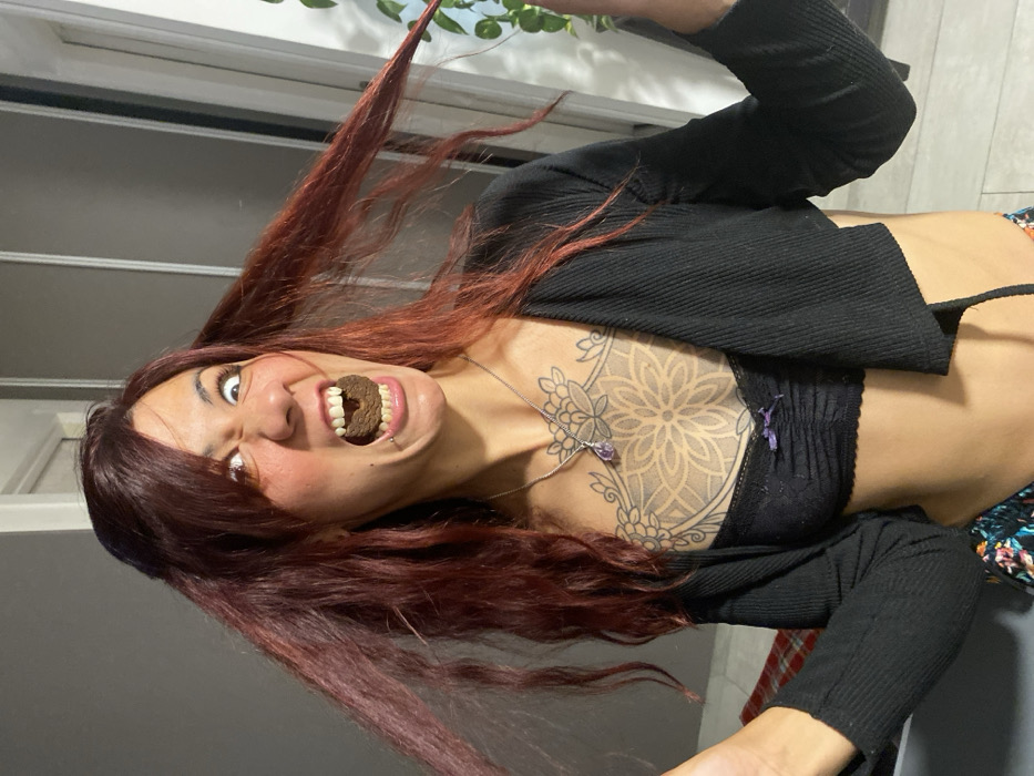 A young woman with red hair and a geometric tattoo on her chest strikes a playful pose. She holds a chocolate cookie between her teeth, her eyes wide and expressive. She's dressed in a black crop top and cardigan, hinting at casual attire. The background includes indoor elements such as a window and greenery, suggesting a home setting. The image is shot from a slightly low angle, adding to the whimsical and dynamic feel.