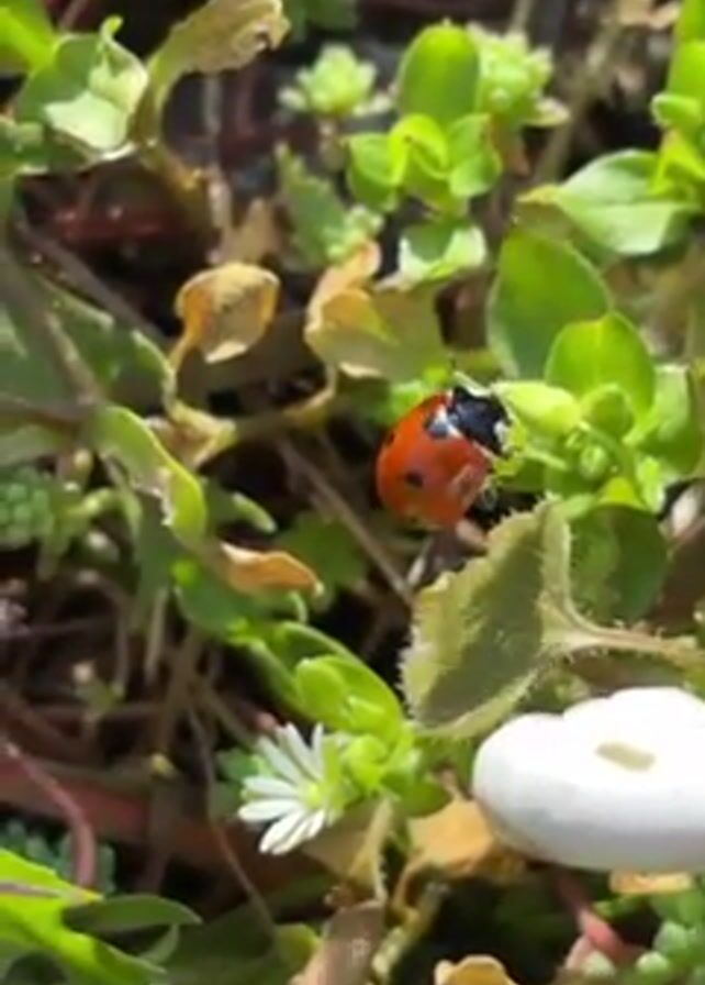 ladybug crawling on green foliage interspersed with small white flowers and brown dead leaves