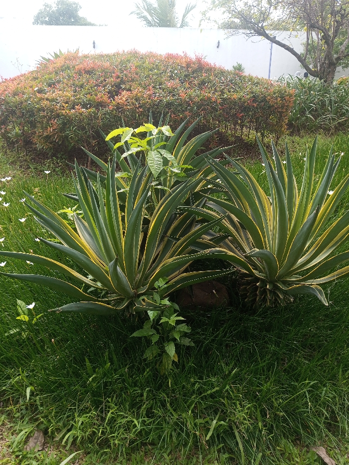 A garden scene displays two variegated agave plants with green and yellow striped leaves, set amidst lush green grass. Smaller green plants sprout nearby. Behind the agave plants, a vibrant hedge with red and green foliage creates a textured backdrop. In the distance, a white wall is visible, topped with a palm tree and a tree with bare branches. The overall scene evokes a tranquil and well-maintained outdoor space.
