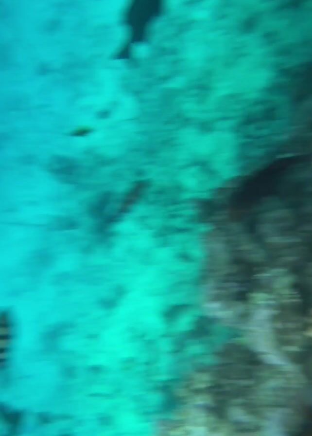 n underwater scene. The initial shot is blurry, showing reflections and a greenish-blue hue. The video then focuses on various fish swimming in clear blue water. Several fish are visible, including striped fish and others with varying colors. The view shifts to a close-up of the seabed, which is blurry.