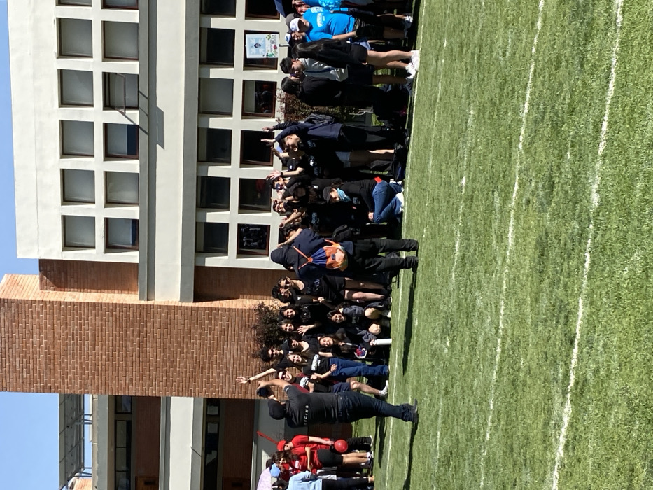 An outdoor scene in Achocalla, Bolivia, depicts a large group of approximately 30-40 individuals, primarily young adults, gathered on a green grass field with white painted lines. The setting is a sunny day, with a clear blue sky. In the background, a multi-story building features a prominent brick facade on the left, adjacent to a section with a light-colored, possibly stucco, finish and multiple grid-patterned square windows across two visible floors. Solar panels are visible on a rooftop structure above the brick section. Two individuals stand in the foreground, facing away from the viewer and towards the main group. The individual on the left wears a dark short-sleeved shirt with "RACING" printed on the back and dark pants; he holds a dark object, likely a camera or phone, raised with his right hand as if taking a picture of the group. The individual on the right wears a dark hooded top, dark pants, and carries an orange and blue backpack; his hands are raised near his head. The large group, positioned in the mid-ground, faces towards the left, posing for the camera. Most individuals wear dark clothing, predominantly black shirts, some with visible logos. A smaller number wear red shirts on the far left, and light blue shirts on the far right. Many individuals are smiling and have their hands raised in various gestures, including waving. Several are standing, while a few in the front row are crouching or kneeling. A person on the far left holds a red balloon or ball. A white water bottle rests on the grass near a crouching individual. To the right of the posing group, a poster featuring a person's image and text is visible on a white stand.
