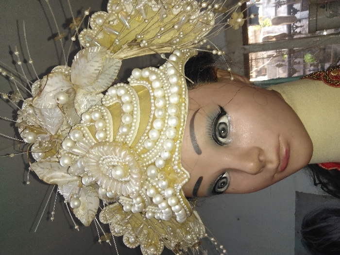 A female mannequin head, displaying an elaborate, multi-layered headdress predominantly in off-white, cream, and pale yellow, is positioned in an indoor setting