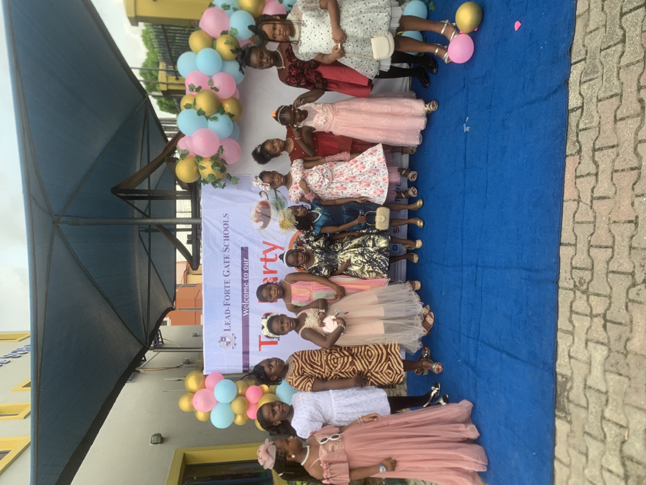 A group of twelve young girls, all dressed in formal dresses and wearing shoes, are standing in front of a banner that says "Lead-Forte Gate Schools" and "Welcome to our Tea Party". The girls are lined up in a row, looking at the camera. The banner is decorated with a garland of balloons in gold, pink, and blue. There is a blue carpet in front of the girls, and the background is a building with a yellow wall and a blue awning. The scene appears to be a schoolyard. The location is Lead-Forte Gate Schools, Lagos, Nigeria. The coordinates given, (latitude: 6.571, longitude: 3.39), are not a precise location within Lagos, but it is likely to be somewhere in the Lagos metropolis.