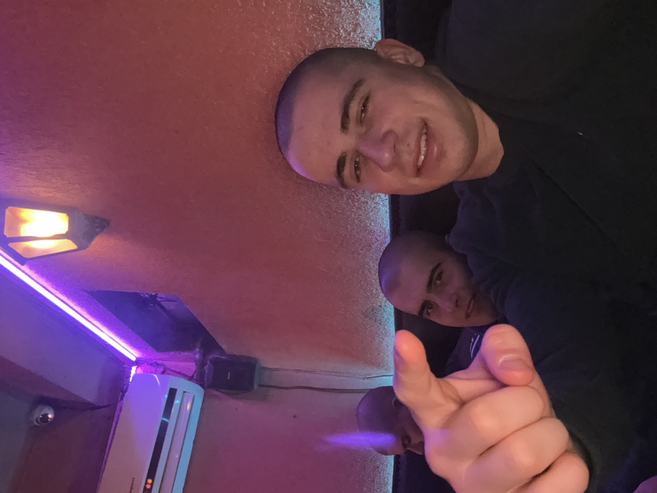 This image depicts three adult males inside a dimly lit commercial establishment, resembling a bar or lounge, located in Varna, Bulgaria. In the foreground, a light-skinned male with a closely shaved head and a dark-colored top is smiling at the camera, extending his right arm with the index finger pointed directly forward. Directly behind him and slightly to his left, a second light-skinned male with a closely shaved head is partially visible, looking towards the camera with a neutral expression. A third individual with a closely shaved head is indistinctly visible further back on the left side of the frame. The interior features reddish-orange textured walls. Along the upper left wall, a strip of purple LED lighting is installed, running parallel to a white wall-mounted air conditioning unit. Above the air conditioner, a small, dark dome-shaped security camera is affixed to the ceiling. A dark rectangular speaker box is mounted on the wall below the air conditioner, with black wiring running vertically downwards. On the upper right wall, a vintage-style lantern fixture emits an orange-yellow glow. Blue or cyan accent lighting is present along a lower section of the wall behind the subjects, creating a contrasting glow.