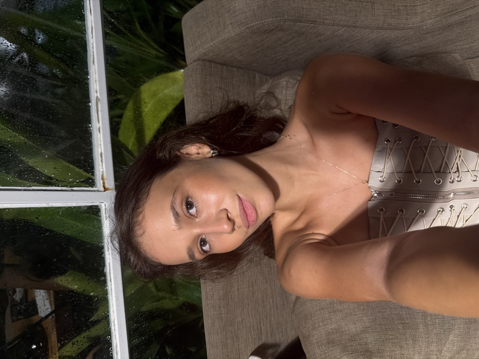 A young adult female is depicted in a front-facing photograph, seated indoors in what appears to be an upholstered armchair or sofa in Kuta, Indonesia. She has medium-length, dark brown hair and is looking directly at the camera with a subtle, closed-mouth smile. She wears a light beige or off-white strapless top, featuring a central zipper and a lace-up design with grommets and crisscrossing cords. A slender gold-colored necklace with a small pendant is visible on her chest, and she wears small hoop earrings. Her right arm is extended towards the camera, consistent with holding the photographic device. Behind the subject, a window with multiple panes and a light-colored frame is visible. The window glass is covered extensively with water droplets. Through the wet window, dark green, broad-leafed foliage, indicative of tropical plants, is discernible against a dark exterior, suggesting an outdoor garden at night or under low light conditions.
