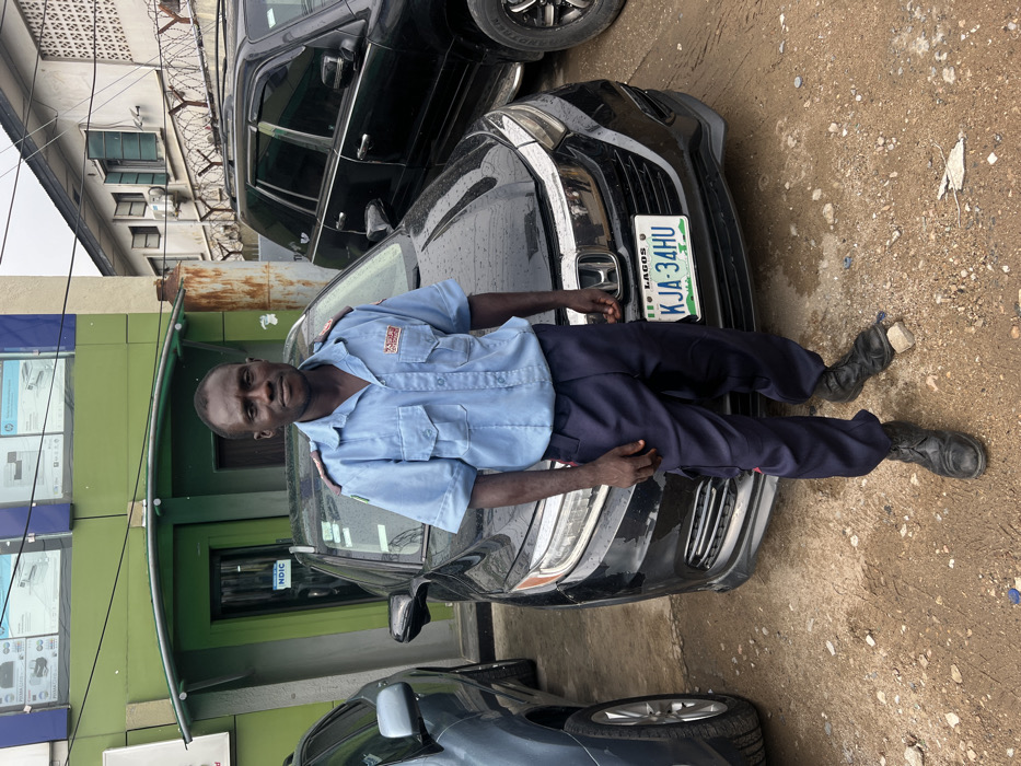 An adult male, estimated to be between 30 and 40 years old, stands centered in the foreground on an unpaved, damp, light brown dirt and gravel surface in Ikeja, Lagos, Nigeria. He wears a light blue, short-sleeved uniform shirt with two breast pockets, dark blue trousers, and black lace-up boots. The shirt features green, white, and green striped epaulets on both shoulders, and a red-bordered patch on the right chest pocket with visible text "LAGOS" above partially obscured characters. His right foot rests on a small, light-colored stone fragment. The man maintains a neutral expression, looking directly towards the camera. Behind the subject is a black Honda SUV, model year consistent with a late 2010s CR-V or HR-V, which appears wet on its surface. The vehicle displays a Lagos State license plate reading "KJA-34HU" on its front bumper. A light blue SUV is partially visible to the left of the Honda, and a black SUV is partially visible on the far right side of the frame, behind the Honda. In the background, a two-story building with a light green facade and a dark green arched canopy over its entrance is present. The upper level of this building displays multiple "HP" branded signs featuring product imagery. A white sign with the acronym "NDIC" is affixed to the glass entrance door. To the right of the green building, a large, rusted corrugated metal cylindrical structure stands near a lighter-colored building featuring windows with security bars and a perimeter wall topped with razor wire. Multiple black utility lines are visible overhead against an overcast sky.