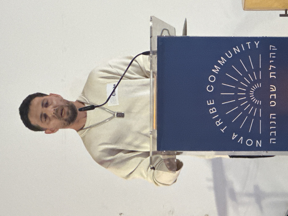 A male individual, appearing to be in his 30s-40s with short dark hair and light facial hair, stands behind a podium. He wears a light beige long-sleeved crew-neck sweater and a silver-colored chain necklace with a rectangular pendant. A white name tag partially visible on his right chest reads "Eliha". His mouth is open, indicating he is speaking. A black gooseneck microphone is positioned in front of him. The podium features a clear acrylic top and a dark blue front panel. The panel displays white text: "NOVA TRIBE COMMUNITY" arched above a stylized sun emblem, and "קהילת שבט הנובה" in Hebrew below the emblem. The background is a plain white wall. The scene is set indoors in Kadima - Zoran, Israel.