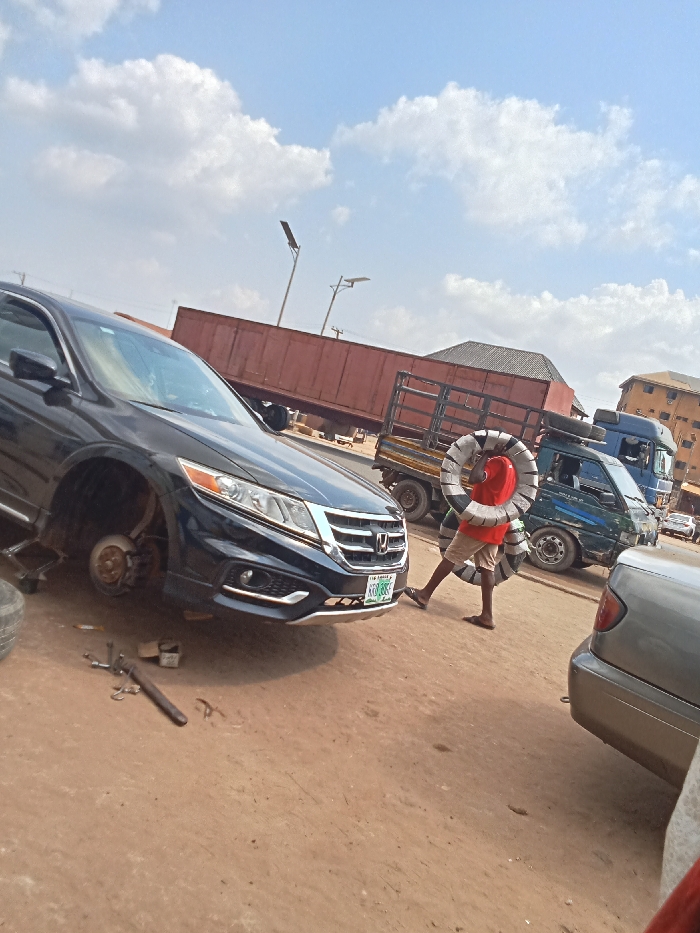 The image depicts an outdoor scene in Awkuzu, Nigeria, resembling a roadside service area or unpaved lot adjacent to a roadway under a partially cloudy blue sky. In the left foreground, a dark-colored Honda SUV, likely a Crosstour model, is parked facing right and slightly towards the viewer. Its front left wheel has been removed, exposing the brake rotor and caliper assembly. The vehicle is supported by a jack positioned beneath its front left side. A single tire lies flat on the reddish-brown, unpaved ground next to the vehicle. A Nigerian license plate, partially obscured, is visible on the front bumper. Various tools, including a lug wrench, are scattered on the ground near the vehicle's removed wheel. In the midground, a male individual walks towards the right side of the frame. He wears a red long-sleeved shirt, light-colored shorts, and sandals. He is actively carrying several white, coiled objects, consistent with new or wrapped tire inner tubes or small tires, around his torso and left arm. In the background, multiple vehicles are present on what appears to be a paved road or shoulder. These include a light-colored sedan (partially visible on the far right), a dark green utility truck or van, a blue semi-truck cab, and a large reddish-brown semi-trailer or dump truck body. Two streetlights equipped with solar panels are mounted on poles in the mid-background against the sky. A multi-story building with orange-brown exterior walls and a darker roof is visible in the far right background. The ground throughout the visible area is primarily reddish-brown unpaved dirt.