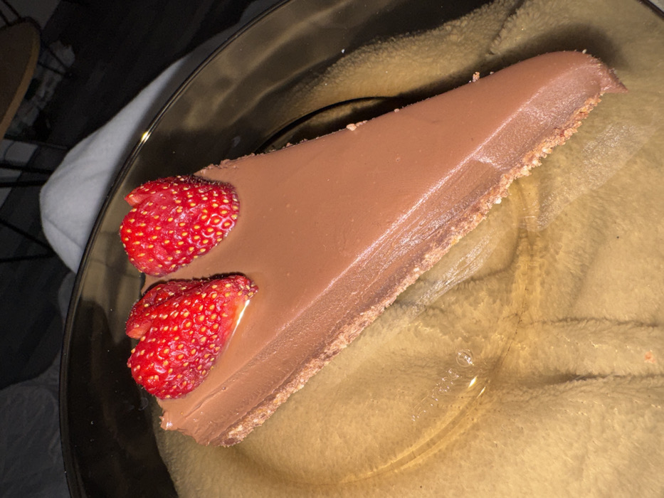 The image presents a triangular slice of dessert on a translucent, amber-tinted plate. The dessert features a bottom layer of coarse, light brown material, consistent with a biscuit or graham cracker crust, beneath a thick, smooth layer of light chocolate-colored cream or mousse. Two whole, ripe red strawberries, each exhibiting a slightly irregular, heart-like shape, are positioned on the upper surface of the cream layer. The plate is resting on a soft, light brown, textured textile, possibly a blanket. The background is dark and out of focus, showing indistinct shapes including a partial white object and dark elements consistent with furniture in a dimly lit indoor environment. No individuals are present in the frame. The specific location within Varna, Bulgaria, cannot be determined from the visual information provided.