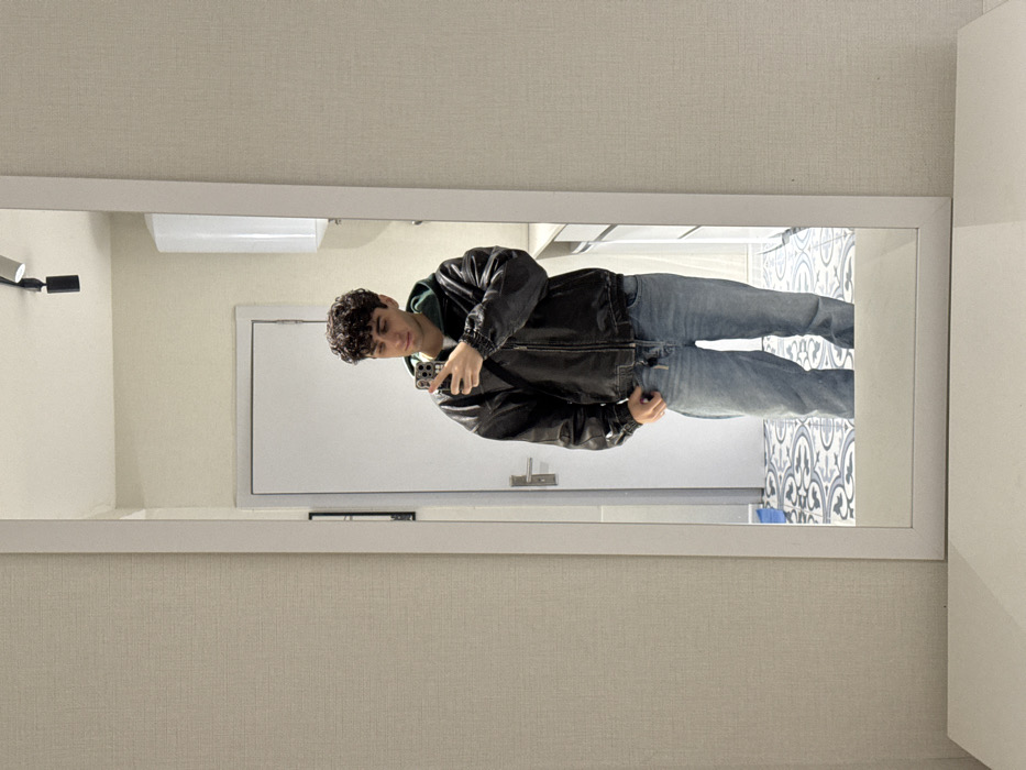 A young man with curly hair poses in a mirror, holding a phone. He wears a black leather jacket over a green hoodie and light-wash jeans. Behind him, a white door is visible, along with a white ventilation unit near the ceiling. Part of a blue and white patterned floor or wall design can be seen on the right. The mirror is framed with white trim and is situated against a textured, beige wall.