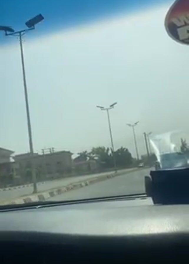 view from inside a car driving down a paved road. The sky is light blue and hazy. On either side of the road are buildings and street lights. Other cars are visible on the road. A sticker is partially visible on the windshield in the upper right corner. The dashboard of the car is visible in the foreground.