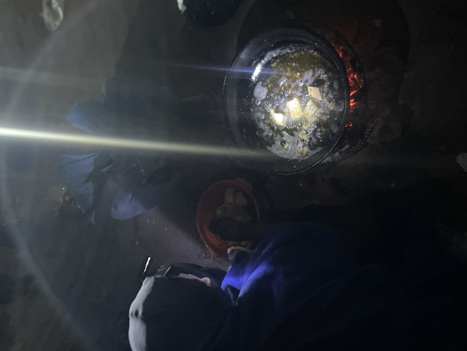 A top-down view in dim lighting reveals a person wearing a blue shirt and white head covering, possibly cooking. A wok-like pan sits above them, filled with bubbling oil and golden, square-shaped foods frying. To the left, a bright light source creates glare across the scene. A red basket with similar golden pieces is partially visible near the person. The background is dark, suggesting an outdoor or poorly lit cooking environment. Red embers can be seen near the wok.