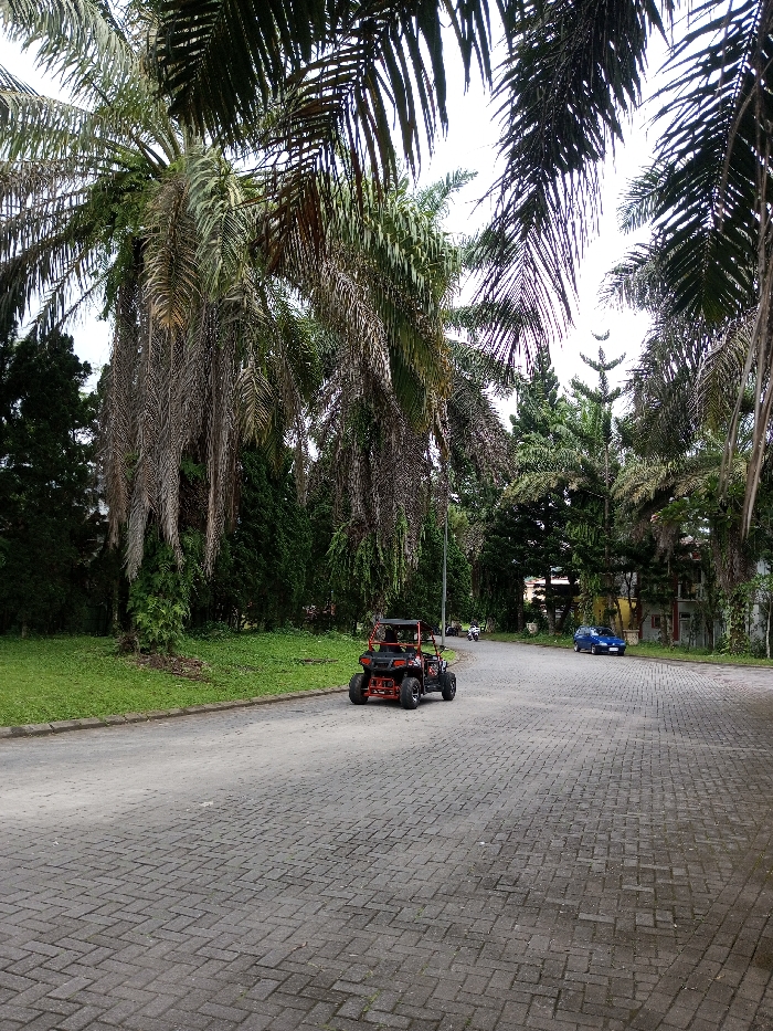 A brick road is framed by tall palm trees and greenery. A black and red ATV sits in the center of the road. Further down the road, a blue car is parked. A few buildings are visible in the background, obscured by trees. The scene appears calm, likely in a residential area.