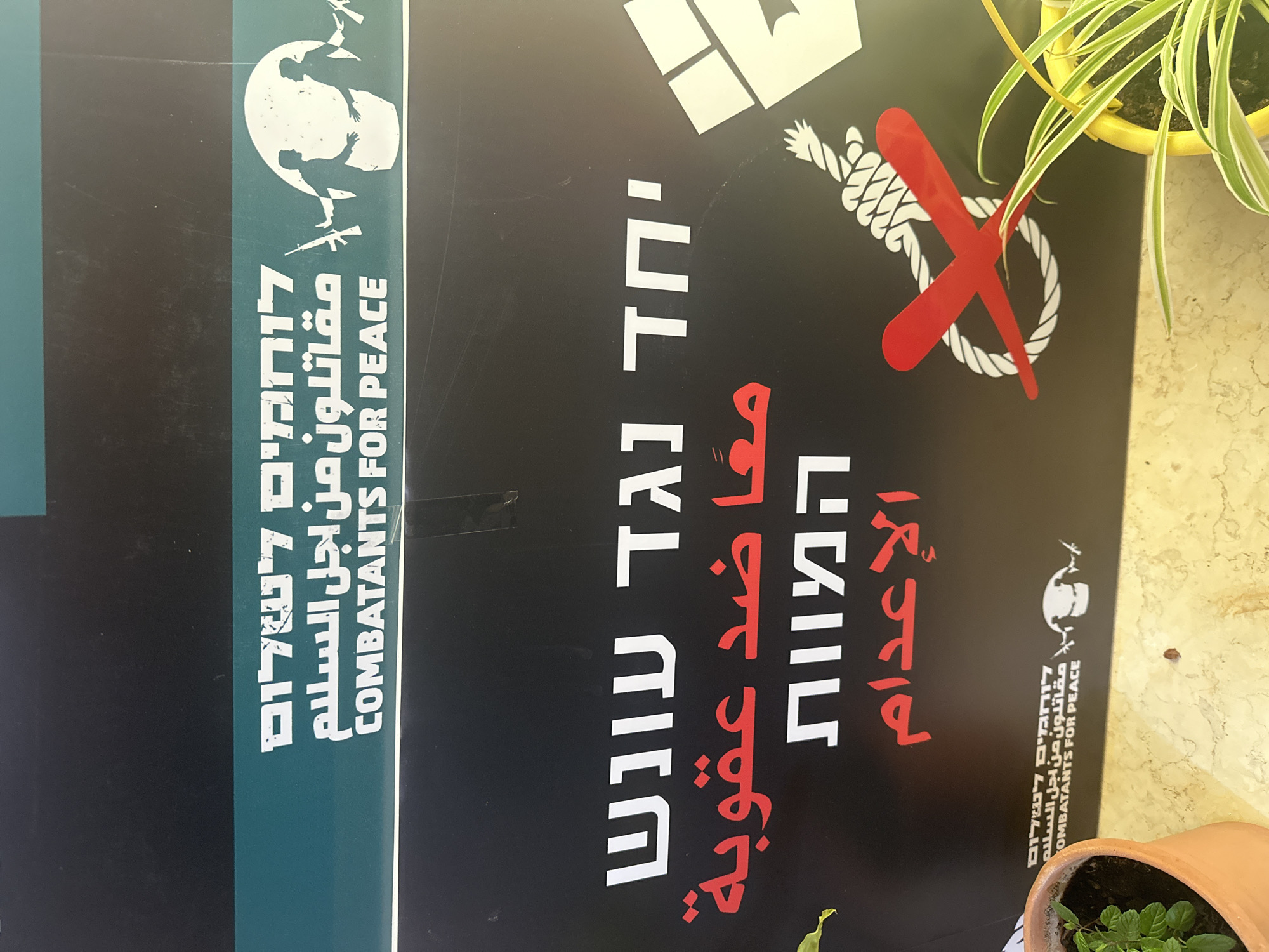 A poster for the organization "Combatants for Peace" is displayed next to potted plants. The poster is black and contains text in Hebrew and Arabic, along with an image of a noose crossed out in red. The text translates to "Together against the death penalty."
