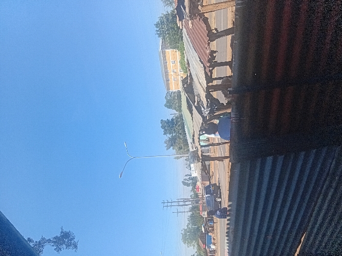 A street scene unfolds under a clear blue sky. Dilapidated, corrugated roofs line the right side of the image. A street lamp and power lines stretch toward the middle distance, where cars are visible on the road. Buildings and trees are scattered along the roadside. The composition is slightly rotated, giving a tilted perspective.