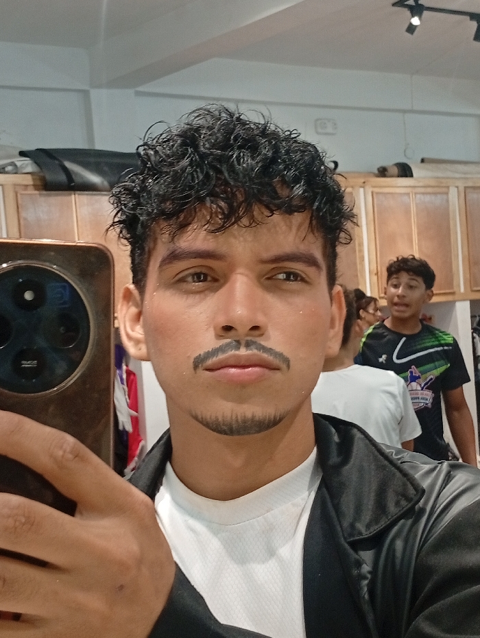 A young man takes a selfie in what appears to be a locker room. He has dark, curly hair, tanned skin, and dark eyes. He sports a thin, fake mustache and a matching goatee. He wears a white t-shirt under a black jacket. Other people are visible in the background, with one person wearing a green and black shirt looking directly at the camera. Overhead lighting and lockers are also in the background. The man is holding a large smartphone up to take the picture.