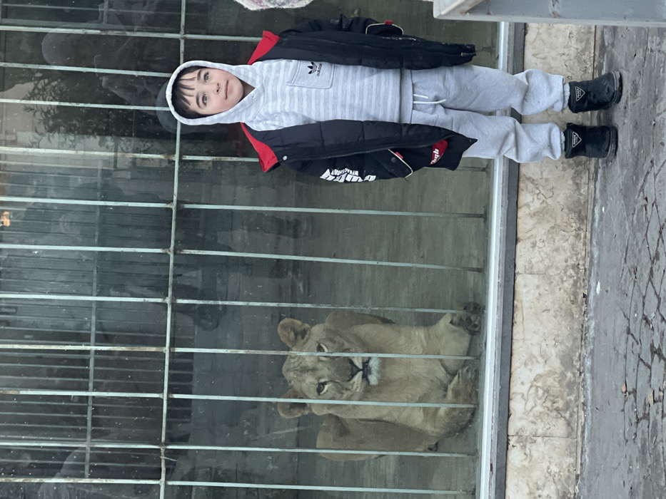 This image depicts a young boy and a lioness separated by an enclosure, likely situated in Barza Municipality, Syria. **Scene Description:** A wide shot captures a young boy standing on a paved ground in front of an animal enclosure. The enclosure features a lioness lying down behind vertical metal bars and a glass barrier. **Subjects:** 1. **A young boy:** Positioned on the right side of the frame, he stands facing slightly to his right, looking upwards and to the right. He appears to be approximately 6-8 years old, with dark hair visible under the hood of a light grey and white striped hooded sweatshirt. The sweatshirt has an Adidas logo on its front pocket. He wears an unzipped black padded jacket with a red interior lining and white text on the left sleeve. His lower attire consists of light grey sweatpants with a white drawstring and black winter boots. 2. **A lioness:** Located on the left side of the frame, within the enclosure. She is an adult female with tawny fur, lying in a relaxed posture on a concrete surface. Her body is positioned parallel to the barrier, with her head turned slightly towards the viewer. Her mouth is slightly agape, revealing teeth. Her front paws are visible, appearing large and dark-tipped. **Objects and Environment:** The boy and the lioness are separated by a clear barrier system. This system comprises prominent vertical metal bars in the foreground, behind which a transparent glass panel is visible. Reflections of distant objects, including faint outlines of trees or structures and other human figures, are discernible on the glass. The enclosure's base is formed by a light brown, textured concrete wall. The ground where the boy stands is paved with irregular, light-colored stones or tiles. No direct interaction is occurring between the boy and the lioness; both subjects are observed in a static state within their respective areas.