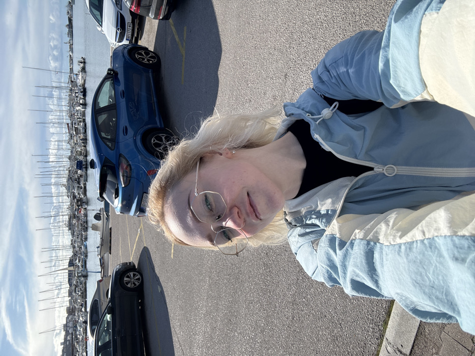 A young Caucasian female with short blonde hair and hexagonal-frame glasses takes a selfie in a sunlit asphalt parking lot in Bar, Montenegro