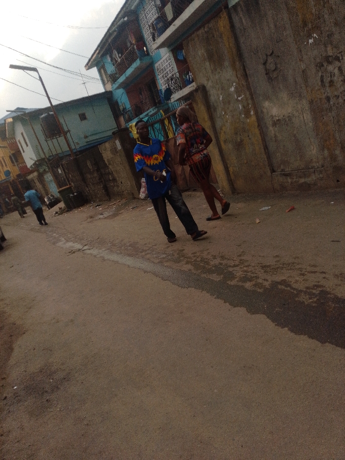 A man in a blue patterned shirt and jeans stands on a street, holding a bottle. A woman in a plaid dress walks beside him. The street is paved, with visible debris and wet patches. Buildings, some painted blue and featuring balconies, line the street. A street lamp is visible on the left. The scene appears to be a residential area with weathered structures. Other individuals are seen in the distance.
