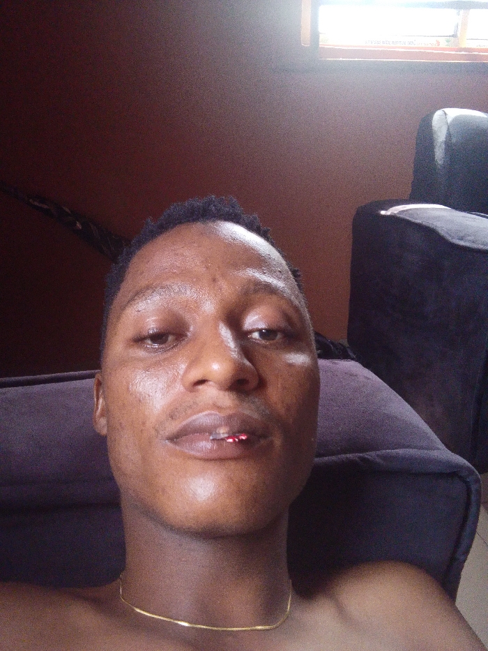 The image, captured in Ankpa, Nigeria, presents a close-up frontal view of a male individual. He possesses dark skin, short dark hair, and a thin gold-colored chain around his neck. A small red object is visible between his partially open lips. The individual is positioned against a dark, upholstered piece of furniture, likely a chair or sofa. The background features a reddish-brown wall. Natural light enters from a window situated in the upper right portion of the frame, illuminating the scene. Additional dark, indeterminate shapes are discernible in the upper left background.