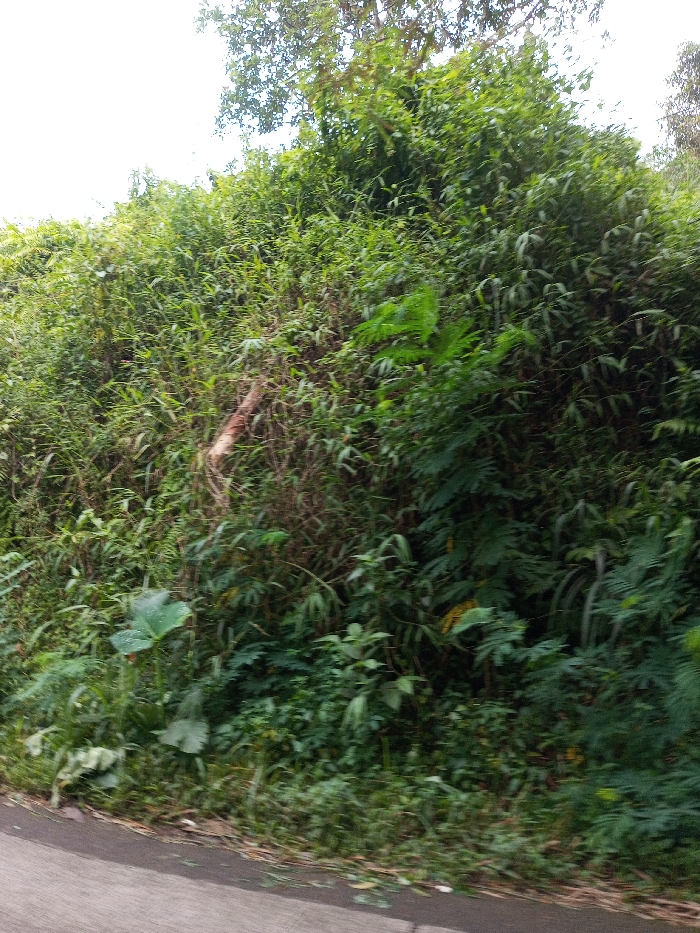 The image displays a dense roadside natural environment in Kandenuwara, Sri Lanka. A grey asphalt or concrete road surface occupies the bottom-left portion of the frame, tapering slightly towards the right and bottom edge. Along the edge of this surface, minimal organic debris is present. Immediately above the road, a thick wall of vibrant green vegetation dominates the scene, rising upwards and extending across the entire width of the frame. This vegetation consists of various types of plants, including large broad-leafed plants visible in the lower-left-midground, numerous smaller leafy plants, ferns, and slender, bamboo-like stalks. Towards the center-left, embedded within the dense foliage, a light-colored, possibly broken or fallen tree branch or trunk segment runs diagonally upwards and to the right. The upper section of the image reveals an overcast sky and the crowns of taller trees above the primary dense undergrowth. No individuals, animals, or discernible actions are present.