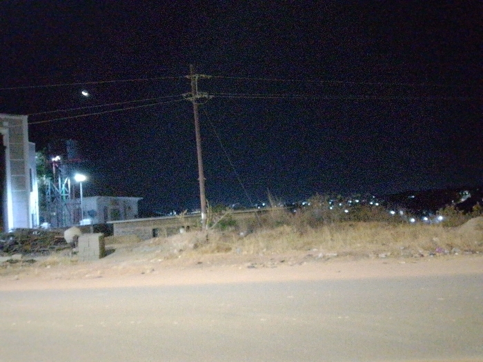 The image presents a nighttime scene in Rayfield, Nigeria, captured from a low vantage point overlooking a road and adjacent undeveloped land towards a distant city